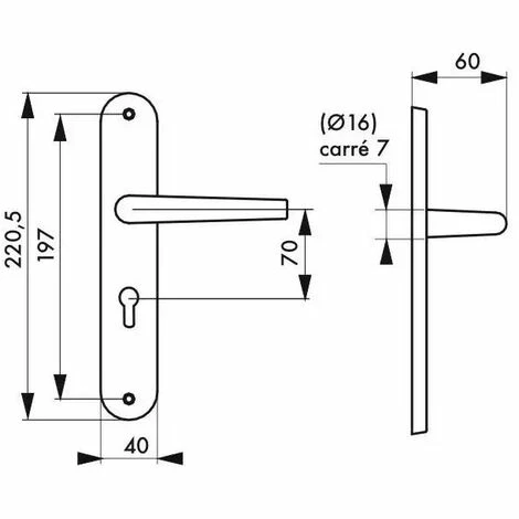 Verrouillage par 3 points latéraux de condamnation. Boîtier principal acier 15/10 ème axe à 50 mm, entr’axe 70 mm – Carré 7 mm. 1/2 tour bipente laiton réversible sans démontage du coffre, équerre au 1/2 tour. Pênes dormant 2 tours acier zingué bichromaté. Boîtier asservis acier 15/10 ème avec pênes zingués rectangulaires. gâche acier profilé 20/10ème. « ¹ Nous vous recommandons d’utiliser un cylindre profilé 30 x 65 mm pour porte d’épaisseur maxi 45 mm. Cylindre profilé ADRIATIC. Profil européen laiton finition nickel velours 30 x 65 mm pour porte de 45 mm. Mécanisme de 6 à 22 goupilles sur 5 rangées. Cylindre équipé de goupilles épaulées trempées anti-crochetage et protégé contre le perçage par 3 aiguilles trempées. Panneton anti arrachement. 4 clés plates laiton nickelé avec insert ABS et titre de propriété permettant la reproduction des clés exclusivement en usine. « ¹ Pièce mobile anti-crochetage interne au cylindre interdisant toute reproduction hors usine.