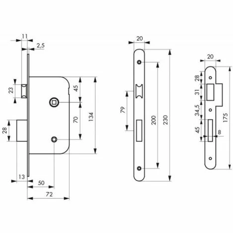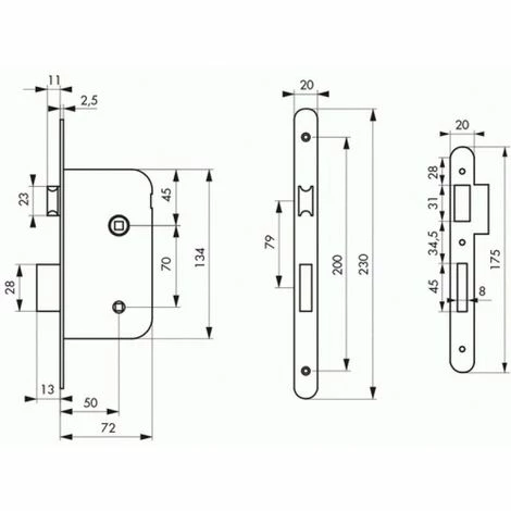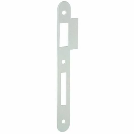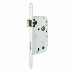 Coffre en acier de 134 x 72 mm. Têtière acier à bout rond de 230 x 20 mm. Pêne demi-tour réversible sans démontage du coffre. Axe : 50 mm. Entraxe : 70 mm. Carré : 7 mm. Finition : laqué blanc.