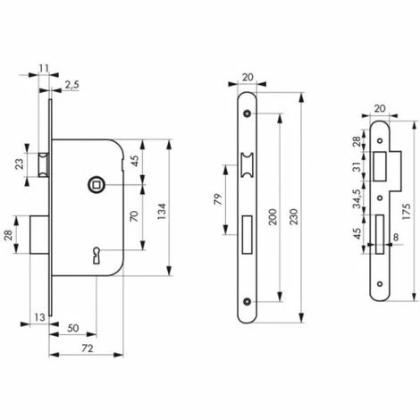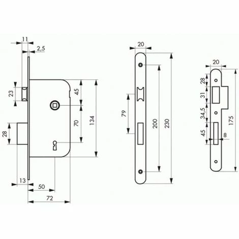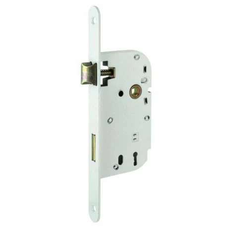 Coffre en acier de 134 x 72 mm. Têtière acier à bout rond de 230 x 20 mm. Pêne demi-tour réversible sans démontage du coffre. Axe : 50 mm. Entraxe : 70 mm. Carré : 7 mm. Finition : laqué blanc.