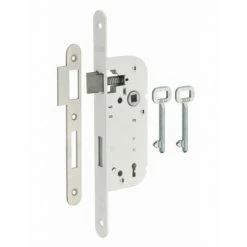 Coffre acier embouti. Têtière acier. Demi-tour alliage réversible sans démontage du coffre. Pêne alliage. Gâche plate acier. Mécanisme à 3 gorges, 2 tours. Carré?7 mm, entraxe 70 mm. 2 clés. 48 variures.