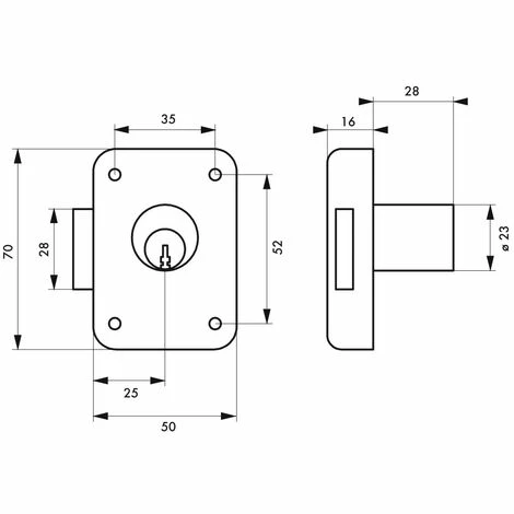 Coffre et pêne acier. Cylindre laiton. à 5 goupilles. 3 clés acier nickelé.- Dimension : 50x70mm