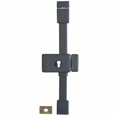 Boîtier en acier embouti ép. 20/10ème, tringle standard permettant une condamnation de porte de 1,65 m à 2,25 m. Mécanisme intérieur type équerre permettant la manoeuvre du 1/2 tour avec la clé, de l’intérieur comme de l’extérieur. Pêne dormant et 1/2 tour en laiton massif. Pêne haut et bas en acier ø 16 mm sur tringles télescopiques en acier permettant un ajustement très précis à la longueur désirée et ne nécessitant aucune recoupe. Cache tringle, guides et gâches de pênes haut et bas en acier ne laissant apparaître aucune vis de fixation. Finition : peinture époxy coloris marron foncé.