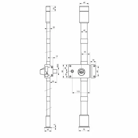 Boîtier en acier embouti ép. 20/10ème. Coffre de 140 x 88 mm. Tringles standard permettant une condamnation de porte de 1,65 m à 2,25 m. Mécanisme intérieur type équerre permettant la manœuvre du 1/2 tour avec la clé, de l’intérieur comme de l’extérieur. Pêne dormant et 1/2 tour en laiton massif. Pêne haut et bas en acier Ø 16 mm sur tringles plates en acier permettant un ajustement très précis à la longueur désirée et ne nécessitant aucune recoupe. Gâche avec têtière de haute résistance. Cache-tringles, guides et gâches de pênes haut et bas en acier ne laissant apparaître aucune vis de fixation. Enjoliveur de cylindre côté intérieur. Carré 6 mm. Le montage des serrures ne nécessite pas d’entaillage spécifique de la porte.