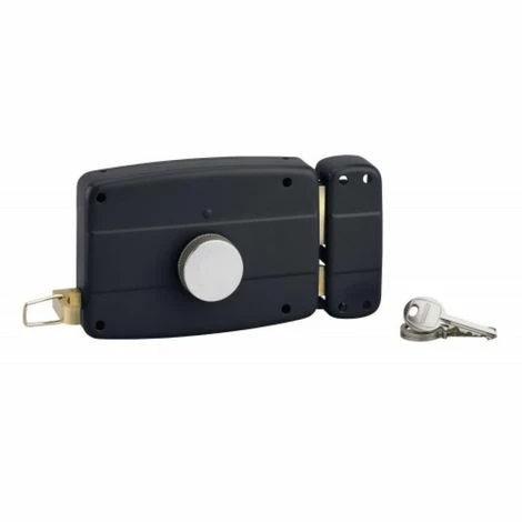 Serrures en applique pour porte de garageSerrures en applique horizontale à tirage à cylindre et bouton pour porte de garage Pour porte de garage battant. Cylindre de sûreté à 5 goupilles diamètre 25 mm longueur 32 mm. Bouton de condamnation intérieure et tirage. Coffre et gâche en acier embouti. Pêne et 5 Ans Garantie