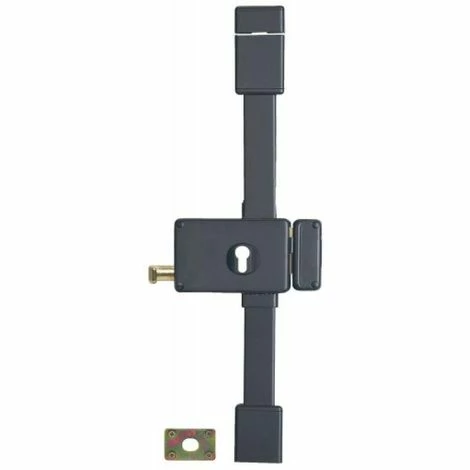 Boîtier en acier embouti ép. 20/10ème, tringle standard permettant une condamnation de porte de 1,65 m à 2,25 m. Mécanisme intérieur type équerre permettant la manoeuvre du 1/2 tour avec la clé, de l’intérieur comme de l’extérieur. Pêne dormant et 1/2 tour en laiton massif. Pêne haut et bas en acier ø 16 mm sur tringles télescopiques en acier permettant un ajustement très précis à la longueur désirée et ne nécessitant aucune recoupe. Cache tringle, guides et gâches de pênes haut et bas en acier ne laissant apparaître aucune vis de fixation. Finition : peinture époxy coloris marron foncé.