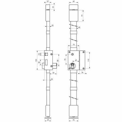 Boîtier en acier cambré ép. 20/10 ème. Coffre de 75x130mm, axe à 45 mm. Tringles standard permettant une condamnation de porte de 1,65 m à 2,25 m. Mécanisme intérieur type équerre permettant la manœuvre du 1/2 tour avec la clé, de l’intérieur comme de l’extérieur. Pêne dormant et demi-tour en acier zingué. Pêne haut et bas rond sur plates en acier permettant un ajustement très précis à la longueur désirée et ne nécessitant aucune recoupe. Gâche têtière de haute résistance. Cache-tringles, guides et gâches de pênes haut et bas en acier ne laissant apparaître aucune vis de fixation enjoliveur de cylindre côté intérieur. Carré 7mm. Poignée double fournie pour serrure à fouillot. Le montage des serrures ne nécessite pas. d’entaillage spécifique de la porte.