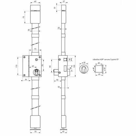 La serrure Targa A2P* s’adapte à une hauteur de porte allant de 1,65 à 2,25m, sans recoupe nécessaire. L’installation est facilitée grâce aux pênes situés en haut et en bas de la structure. Sur une tringle plate en acier et de diamètre de 16 mm, les pênes permettent un ajustement très précis à la longueur désirée. De plus, la pose de la serrure Targa A2P* ne requiert pas un entaillage spécifique de la porte.