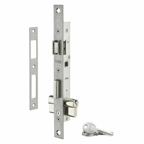 Serrure pour porte métallique. Coffre acier. Têtière inox. Demi-tour réversible sans démontage du coffre. Pêne alliage nickelé. Gâche plate inox. Carré 8 mm avec fourreau réducteur 7 mm. Entraxe 70 mm. Zingué. Livré avec cylindre standard nickelé 30 x 30 mm 5 goupilles, 3 clés panneton réduit.Coffre acier. Têtière inox. Demi-tour réversible sans démontage du coffre. Pêne alliage nickelé. Gâche plate inox. Carré 8 mm avec fourreau réducteur 7 mm. Entr’axe 70 mm. Zingué. Livré avec cylindre Standart nickelé 30 x 30 mm 5 goupilles 3 clés panneton réduit.