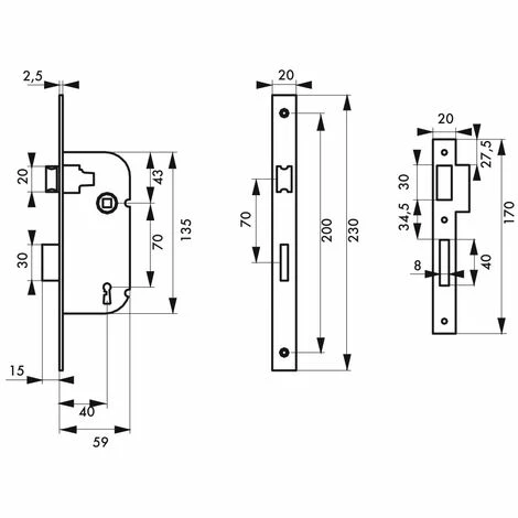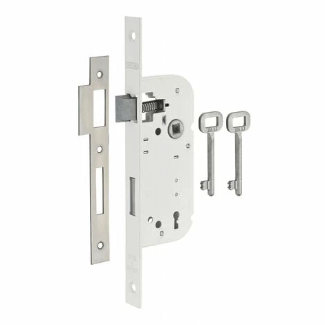 Coffre acier embouti. Têtière acier. Demi-tour alliage réversible sans démontage du coffre. Pêne alliage. Gâche plate acier. Mécanisme à 3 gorges, 2 tours. Carré 7mm, entr’axe 70 mm. 2 clés. 48 variures.- Dimension : 59x135mm