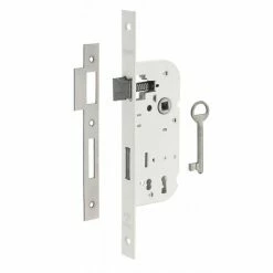 Coffre acier embouti. Têtière acier. Demi-tour alliage réversible sans démontage du coffre. Pêne acier. Gâche plate acier. Carré 7mm, entr’axe 70 mm. 1 clé. 6 variures.- Dimension : 59x135mm
