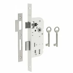 Coffre acier embouti. Têtière acier. Demi-tour alliage réversible sans démontage du coffre. Pêne acier. Gâche plate acier. Carré 7mm, entr’axe 70 mm. 1 clé. 6 variures.- Dimension : 59x135mm