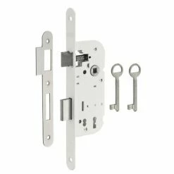 Coffre acier embouti. Têtière acier. Demi-tour alliage réversible sans démontage du coffre. Pêne acier. Gâche plate acier. Carré 7mm, entr’axe 70 mm. 1 clé. 6 variures.- Dimension : 59x135mm