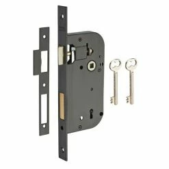 Coffre acier embouti. Têtière acier. Demi-tour alliage réversible. Pêne acier. Gâche plate acier. Mécanisme à 4 gorges 2 tours. Rappel du 1/2 tour par la clé. Carré 7mm, entr’axe 70 mm. 2 clés en acier nickelé. 12 variures