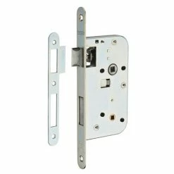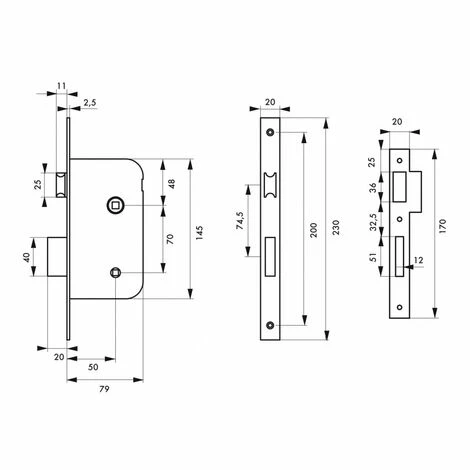 Coffre acier embouti. Têtière acier. Demi-tour réversible sans démontage du coffre. Pêne alliage zingué. Gâche plate acier. Carré 7mm, entr’axe 70 mm.- Dimension : 79x145mm