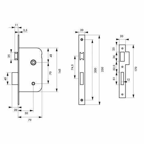 Coffre acier embouti. Têtière acier. Demi-tour réversible sans démontage du coffre. Pêne alliage zingué. Gâche plate acier. Carré 7mm, entr’axe 70 mm.- Dimension : 79x145mm