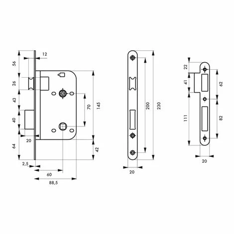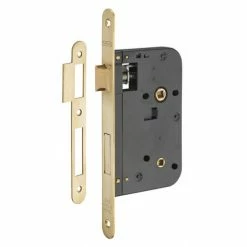 Coffre acier embouti. Têtière laiton. 1/2 tour laiton réversible sans démontage du coffre. Pêne laiton. Carré 7mm. Gâche plate selon finition.