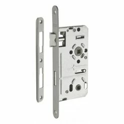 Coffre acier cambré. Têtière acier bouts ronds. Demi-tour polyamide. Fouillot polyamide. Pêne polyamide. Mécanisme à 1 tour. Carré 8 mm. Gâche équerre acier.