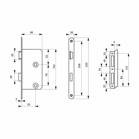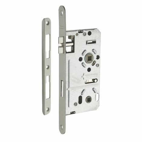 Coffre acier cambré. Têtière acier bouts ronds. Demi-tour polyamide. Fouillot polyamide. Pêne polyamide. Mécanisme à 1 tour. Carré 8 mm. Gâche équerre acier.