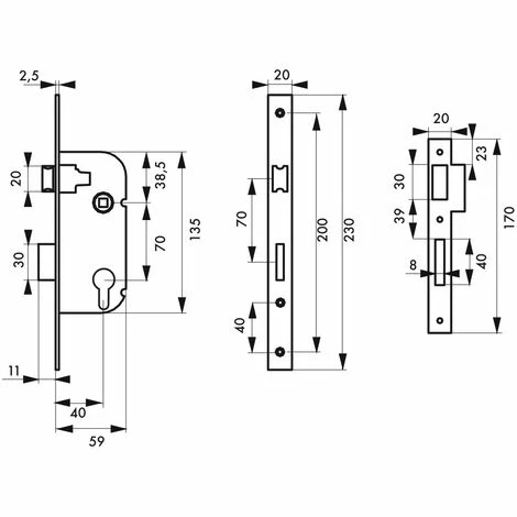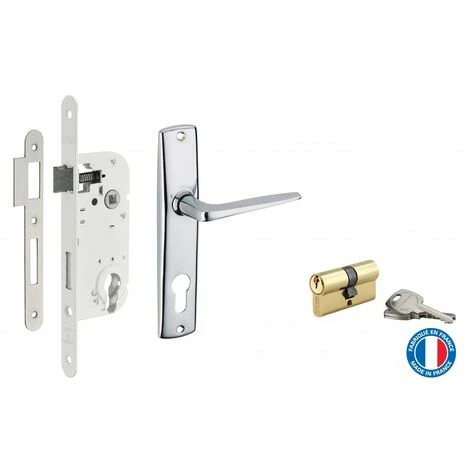 Coffre acier embouti. Têtière acier. Demi-tour alliage réversible sans démontage du coffre. Pêne alliage. Gâche plate acier. Mécanisme à 1 tour. Carré 7mm, entr’axe 70 mm. Sans rappel du 1/2 tour par la clé.- Axe : 40 mm