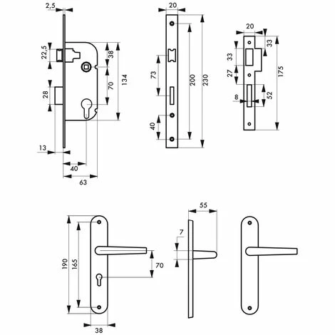 Coffre acier embouti. Têtière acier. Demi-tour alliage réversible sans démontage du coffre. Pêne alliage. Gâche plate acier. Mécanisme à 1 tour. Carré 7mm, entr’axe 70 mm. Sans rappel du 1/2 tour par la clé.- Axe : 40 mm