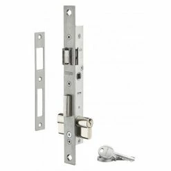 Coffre acier. Têtière inox. Demi-tour réversible sans démontage du coffre. Pêne alliage nickelé. Gâche plate inox. Carré 8 mm avec fourreau réducteur 7 mm. Entr’axe 70 mm