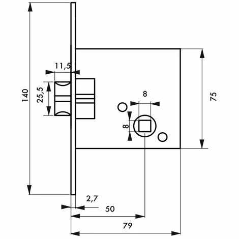 Coffre acier embouti. Têtière acier bouts Carrés. Demi-tour réversible sans démontage du coffre. Gâche plate acier. Carré 8 mm.Conçue pour fermer efficacement vos portes d’intérieur, cette serrure à bec de cane à encaster en acier est fourni avec une gâche plate en acier. Dotée d’un demi-tour réversible sans démontage, cette serrure de la marque Thirard s’installe facilement et offre une fermeture optimal de votre porte. Cette serrure de porte à fouillot dispose d’un axe à 50mm et d’une têtière à bouts carrés en acier.- Dimension : 79x75mm