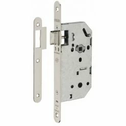 Coffre acier embouti. Têtière acier bouts ronds. Demi-tour bipente alliage réversible sans démontage du coffre. Gâche plate acier zingué. Carré 7mm.