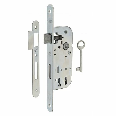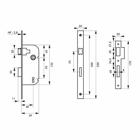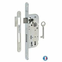 Coffre acier embouti. Têtière acier. Demi-tour alliage réversible sans démontage du coffre. Pêne acier. Gâche plate acier. Mécanisme à 1 tour. Carré 7mm, entr’axe 70 mm. 1 clé – 6 variures.Résistante, durable et sécurisée, cette serrure à pêne dormant à encaster en acier est conçue pour équiper les portes intérieures. Elle est fournie avec sa gâche plate en acier et une clé. Certifiée NF et dotée d’un demi-tour réversible sans démontage et d’un mécanisme à un tour, cette serrure Thriard s’installe facilement et offre un verrouillage efficace de votre porte pour garantir votre intimité. Cette serrure de porte à condamnation est disponible en différentes versions : à têtière à bouts carrés ou arrondis, en finition noir granité ou zinguée.- Dimension : 59x135mm