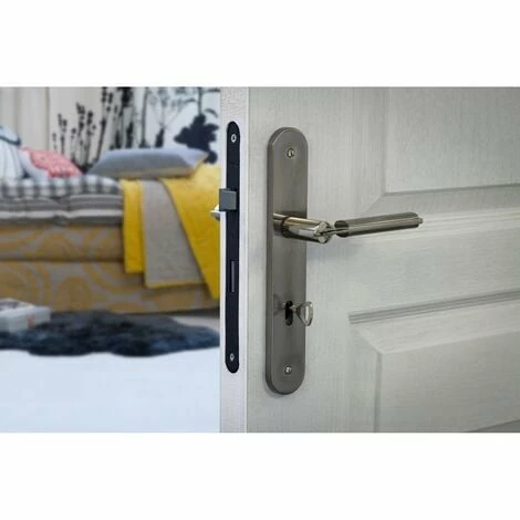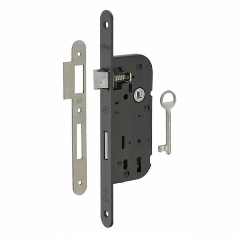 Coffre acier embouti. Têtière acier. Demi-tour alliage réversible sans démontage du coffre. Pêne acier. Gâche plate acier. Mécanisme à 1 tour. Carré 7mm, entr’axe 70 mm. 1 clé – 6 variures.- Dimension : 59x135mm