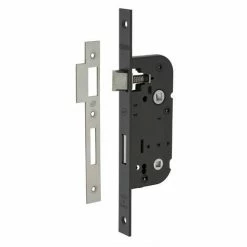 Coffre acier embouti. Têtière acier. Demi-tour alliage réversible sans démontage du coffre. Pêne acier. Gâche plate acier. Carré 7mm, entr’axe 70 mm.