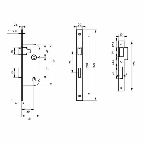 Coffre acier embouti. Têtière acier. Demi-tour alliage réversible sans démontage du coffre. Pêne acier. Gâche plate acier. Carré 7mm, entr’axe 70 mm.- Dimension : 59x135mm