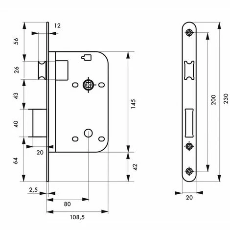 Coffre acier embouti. Têtière laiton. 1/2 tour laiton réversible sans démontage du coffre. Carré 7mm. Gâche plate selon finition.- Dimension : 108.5x145mm