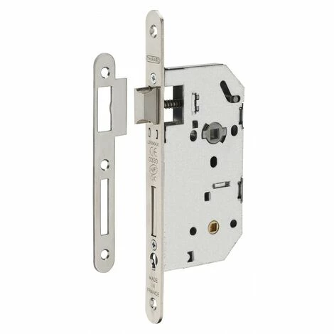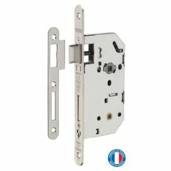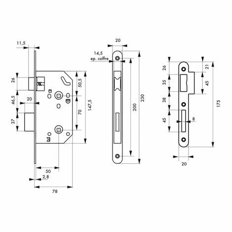 Coffre acier embouti galvanisé. Têtière acier bouts ronds. Demi-tour bipente laiton réversible sans démontage du coffre. Pêne acier zingué – Gâche plate acier zingué. Carré 7mm, entr’axe 70 mm.- Dimension : 78×147.5mm