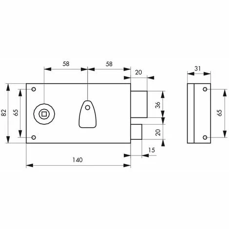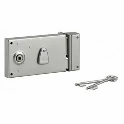 Coffre et gâche acier cambré. Pêne et demi-tour acier. Canon acier longueur 35 mm. Entrée de clé laiton sur coffre. Mécanisme à 2 tours. Pêne 1/2 tour réversible pour porte ouvrant à l’extérieur. Carré 6 mm – 2 clés nickelées – 6 variures. Entrée de clé et de fouillot acier.- Dimension : 140x82mm
