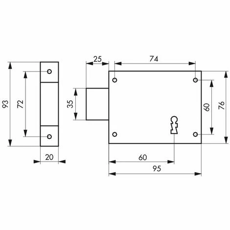 Coffre en acier cambré. Gâche à pattes acier cambré. Pêne alliage. Canon acier long. 35 mm. 1 clé polie. 6 variures.- Dimension : 95x76mm