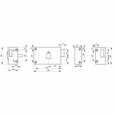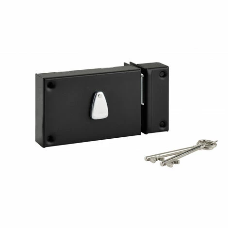 Coffre et gâche acier cambré. Pêne soudé acier zingué. Canon en alliage long. 45 mm, mécanisme 6 gorges à 2 tours. 2 clés nickelées. 20 variures. Entrée de clé acier zinguée.- Dimension : 140x88mm