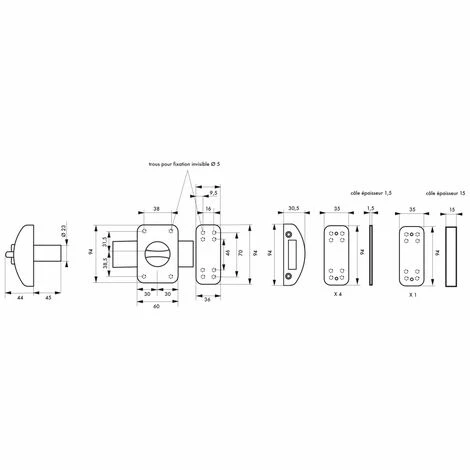 Le Verrou Design est équipé d’un cylindre laiton a 5 goupilles avec une protection anti-arrachement, fournit avec 3 clés et 5 cales de gâches pour porte à recouvrement. Le coffre, la gâche et le pêne sont en acier.