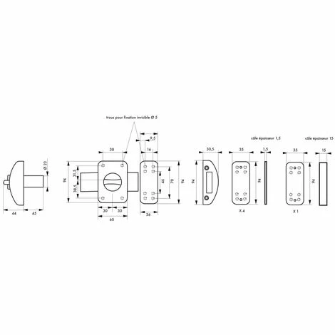 Le Verrou Design est équipé d’un cylindre laiton a 5 goupilles avec une protection anti-arrachement, fournit avec 3 clés et 5 cales de gâches pour porte à recouvrement. Le coffre, la gâche et le pêne sont en acier.
