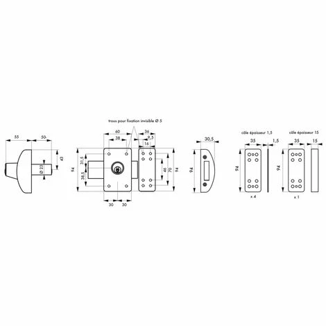 Le Verrou Design est équipé d’un cylindre laiton a 5 goupilles avec une protection anti-arrachement, fournit avec 3 clés et 5 cales de gâches pour porte à recouvrement. Le coffre, la gâche et le pêne sont en acier.
