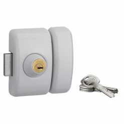 Le Verrou Universel est équipé d’un cylindre laiton a 5 goupilles avec une protection contre l’arrachement du cylindre par pilier et cavalier, fournit avec 3 clés. Le coffre, la gâche et le pêne sont en acier.
